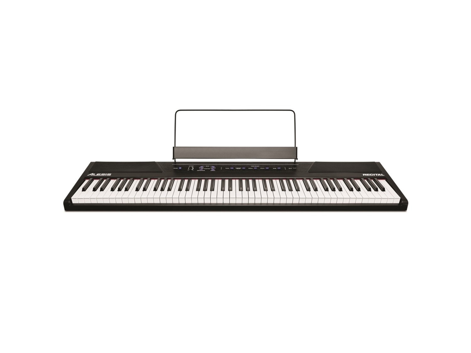 Sono inoltre disponibili effetti di riverbero e chorus (5 preset ciascuno), presa per il collegamento di un pedale sustain (non fornito in dotazione) e altoparlanti amplificati (30W). Alesis Recital offre una funzione chiamata ?Lesson Mode? che suddivide la tastiera da 88 tasti in due zone configurate con lo stesso timbro e la stessa intonazione, per consentire all?insegnante e all?allievo di eseguire insieme, sullo stesso strumento gli esercizi didattici. Presente anche un?uscita cuffia su presa Jack TRS da ¼? che, una volta collegata la nostra cuffia disabiliterà l?amplificazione integrata per consentire di allenarsi senza disturbare.