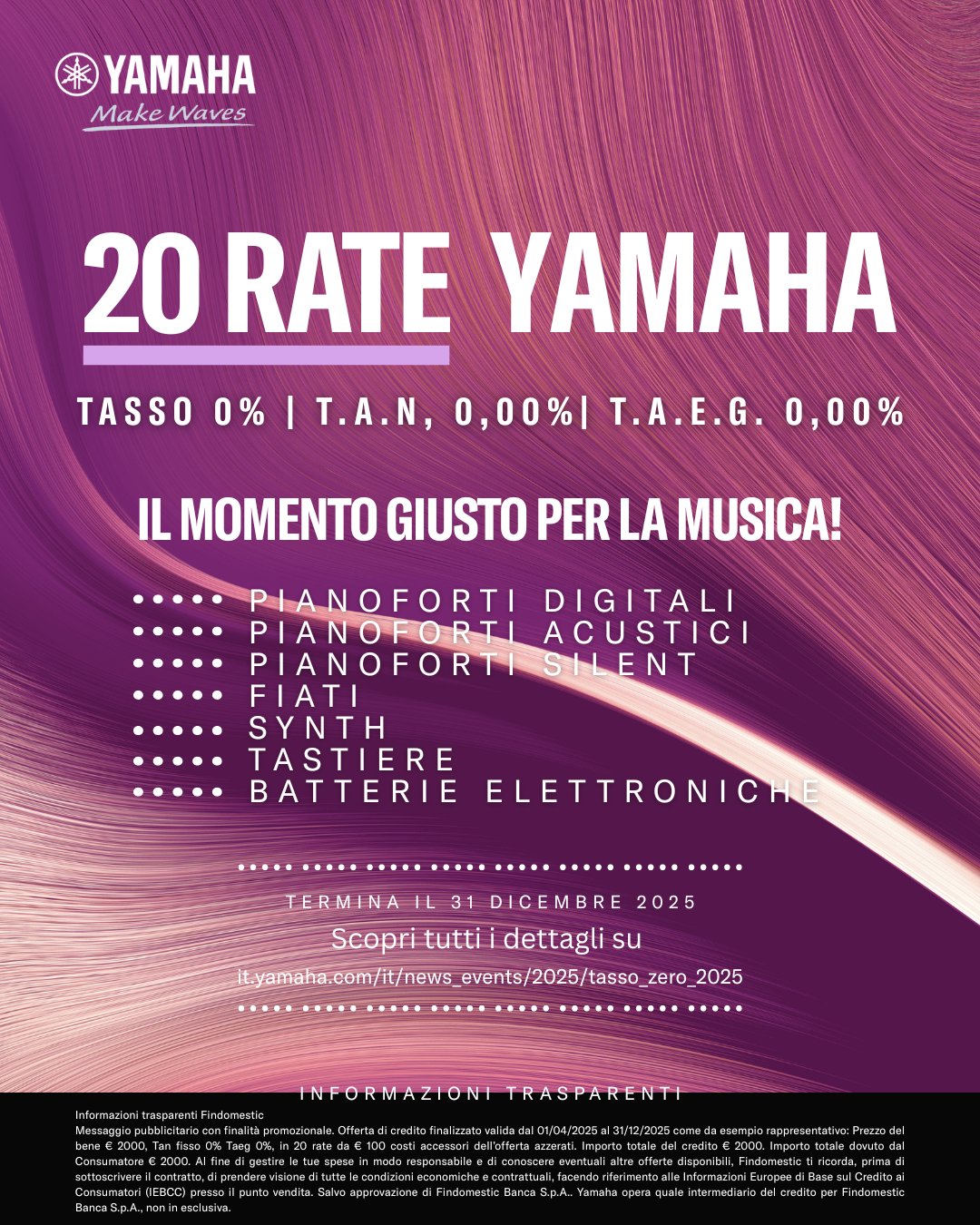 *) Mess. pub. con finalità promozionali. Rappresentativo RataChiara. Offerta di credito finalizzato valida dal 01/01/2025 al 31/12/2025 . Es: € 999, TAN fisso 9,55%, TAEG 9,98 % in 30 rate da € 37,56; Totale del credito: € 999,00 totale dovuto: € 1126,80. TAN e TAEG validi fino al 30 Settembre 2025. Per i trimestri successivi fare riferimento alle Informazioni Europee di Base sul Credito ai Consumatori. Prima rata a 90 gg. Informazioni (IEBCC/SECCI) nel percorso online. Salvo approvazione di Findomestic Banca S.p.A. per cui Panharmonikon.net opera quale intermediario del credito non in esclusiva.